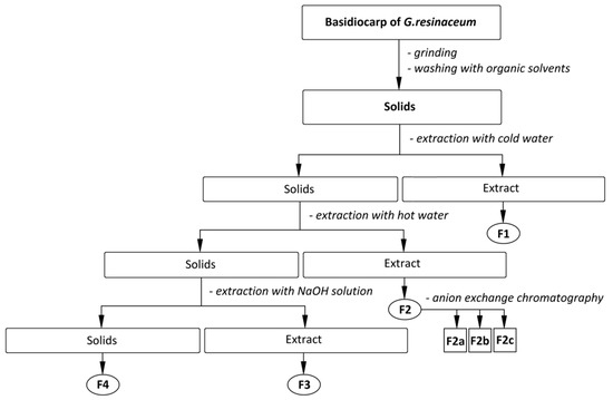 The scheme of isolation of the polysaccharidic fractions F1, F2, F3, and F4 and sub-fractions F2a–c from basidiocarps of G. resinaceum.