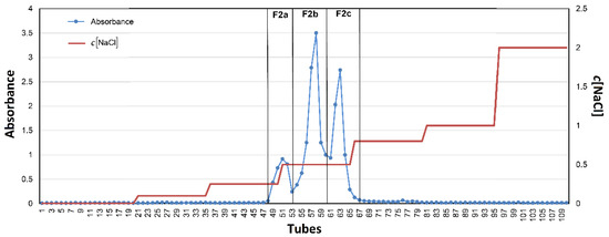 A chromatogram describing the fractionation of F2 is represented in Figure 3. According to the record, the tubes were merged into three sub-fractions, one minor (tubes 47–51) and two major ones (tubes 52–60 and 62–70), assigned as F2a, F2b, and F2c, respectively. All three fractions were dialyzed (1000 Da cut off) and then lyophilized. The yields of these sub-fractions compared to F2 are summarized in Table 5.