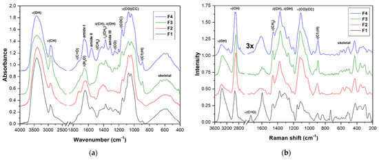 FTIR and FT Raman spectra of the fractions F1–F4 are shown in Figure 4a,b. The assignment of vibrational bands is given according to the literature [45,48,82,83,84,85]. The spectra of all fractions showed several intense overlapping IR bands in the range of 950–1200 cm−1, mainly CC and CO stretching vibrations of the pyranose rings, proving the presence of polysaccharides as the main component of the samples analyzed. An IR band around 1157 cm−1 can be assigned to the stretching vibration of the COC glycosidic bonds. Several Raman bands at 1417, 1276, 1205, 1116, 1093, and 1029 cm−1 are also characteristic for polysaccharides. A weak IR/Raman band around 897 cm−1 from C1H is present in all spectra and is characteristic of β-anomeric unit configurations, which could indicate β-glucans and, in the case of insoluble part F4, also chitin. Additional IR bands and shoulders that can be assigned to β-glucans were found near 1375, 1315, 1157, 1073, and 1040 cm−1 [84]. The FTIR spectrum of F4 has three bands at 1656 cm−1 (amide I), 1557 cm−1 (amide II), and 1317 cm−1 (amide III) that indicate the presence of chitin. In the case of the F1, the IR bands of amide vibrations around 1648 and 1546 cm−1 were assigned to proteins [86]. The presence of chitin and proteins in the mentioned fractions was also confirmed by the significant nitrogen content (see Table 2).