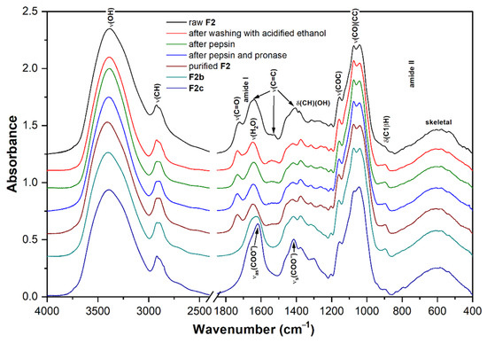 The spectra of the lyophilized raw fraction F2 and the products of its successive purification including sub-fractions F2b and F2c obtained by anionic preparative chromatography are shown in Figure 5. In all these spectra, the intense highly overlapped bands at 950–1200 cm−1 confirmed the predominance of polysaccharides. Phenolic compounds and other small molecules were removed by washing with 0.2 mol L−1 HCl in ethanol, which was confirmed by a decrease in a number of bands related to stretching vibrations of C=C bonds. To remove protein residues, a two-step enzymatic hydrolysis with pepsin and pronase was used. This is because pepsin is capable of cleaving long polypeptide chains into fragments that are still quite large and thus cannot be completely removed. Therefore, for a more complete hydrolysis of proteins, other proteases should be used after pepsin to cleave these fragments into smaller peptides and free amino acids that can be easily removed. The change in the protein content in the fraction can be traced to the intensity of the bands of amide vibrations at about 1647 cm−1 (amide I) and 1540 cm−1 (amide II) [86]. It should be noted here that the amide I band is not well suitable for the detection of the reminder protein due to overlap with the pronounced scissor vibrations of bound water, and therefore, it is better to use the less intense amide II band for this purpose. As a result, after all purification procedures, the band of amide II became insignificant, which confirms the effective removal of proteins. On the other hand, the two vibration bands of the carboxyl groups at 1740 cm−1 (C=O stretching) and 1240 cm−1 (CO stretching) remained unchanged after purification, so these groups are most likely part of polysaccharides, possibly in the form of uronic acids [87]. The spectra of sub-fractions did not contain these two bands; instead, the presence of two bands near 1610 cm−1 and 1405 cm−1, which were assigned to the antisymmetric and symmetric stretching vibrations of the carboxylate anions, respectively, confirmed that the sub-fractions, especially F2c, probably contain uronic acids, but in the form of a salt [87]. These two carboxylate bands were not strongly pronounced in the FTIR spectrum of F2b; therefore, this sub-fraction contained fewer uronic acids. The spectra of both sub-fractions have several bands at 1375, 1315, 1155, 1075, 1040, and 895 cm−1 characteristic for β-anomeric glucose units and, therefore, β-glucans [65,66,67,68,69].