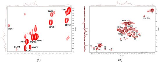 The COSY NMR spectrum of the fraction F1 (Figure 6a) showed several H1α/H2 cross peaks assigned to, 1,6-linked (A, A’) and 1,2,6-linked α-d-galactosyl (C, C’), terminal β-d-mannosyl (B, B’), and 1,4-linked α-d-glucosyl (G) units. These units probably come from two polysaccharides, i.e., branched O-2-β-d-mannosyl-(1→6)-α-d-galactan, and, in smaller amounts, amylose-like (1→4)-α-d-glucan. In contrast to mannogalactans previously described for mushrooms of genus Pleurotus [36,90,91], this mannogalactan obtained from G. resinaceum was not methylated at the O-3 position of the backbone galactosyl units because no signals of OCH3 groups were found. Moreover, several H1β/H2 cross peaks were assigned to terminal β-d-glucosyl (D), 1,6-linked β-d-glucosyl (D’), 1,3-linked β-d-glucosyl (E), 1,3,6-linked β-d-glucosyl (E’), and 1,4-linked β-d-glucosyl (F, F’) units; all of them are probably parts of a highly branched (1→3)(1→4)(1→6)-β-d-glucan. The HMQC spectrum (Figure 6b) shows the signals that indicate the presence of the CHOH, CHOR, CH2OH, and CH2OR’ residues of the above polysaccharides. The HMQC signal of CH3 at 1.20 ppm/16.2 ppm and COSY cross peak at 1.20 ppm/4.13 ppm arose from the α-fucosyl units (H). The HMQC signal at 2.02 ppm/22.9 ppm indicated a small amount of O-acetyl groups. Therefore, according to the relative intensities of the resonance signals and previous analyses mentioned above, F1 contains branched mannogalactan as the main product, lower content of branched β-glucan, and a negligible amount of α-glucan. Water-soluble heterogalactan has been previously isolated from the fruiting bodies of Ganoderma atrum [52]. As in the case of the current study, this polysaccharide had a backbone of 1,6-linked α-d-galactosyl units, but in this case, terminal α-l-fucosyl and α-d-mannosyl units and oligosaccharide fragments can act as side chains attached to the O-6 position of some of the backbone units.