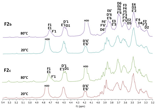 1H NMR spectra of the sub-fractions F2b and F2c measured in D2O at 20 °C and 80 °C.