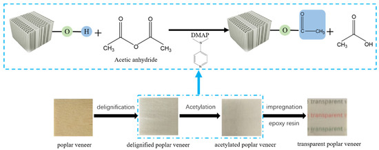 Scheme of the preparation process of transparent poplar veneers by acetylation modification.