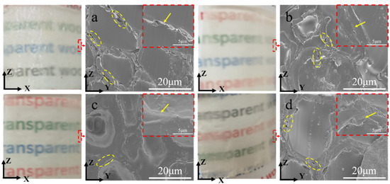 Compared to natural wood, the dimensional stability and flexibility of transparent wood are greatly improved due to the impregnation of polymers. As a porous hydrophilic biomaterial, the physicochemical properties of wood are greatly affected by the change of environmental moisture and temperature; however, the transparent polymers used commonly, such as epoxy resin [4], polyving akohol [5], and polystyrene [6], are nearly absolutely hydrophobic materials; therefore, the incompatibility of the interface results in a great deal of micro-nano gaps among the wood cell wall and polymers. On the other hand, the repeated shrinkage and expansion of the cell wall would cause an increase in local stress because of the constant changing of environmental temperature and humidity, which would weaken the interface connection and lead to massive interface separation [7]. Accordingly, the interface separation further increases the interspace in the interior of transparent wood, which brings about a great deal of light scattering and hence greatly decreases the light transmittance of wood. At the same time, the existing of large number of gaps in transparent wood would also result in a decrease in mechanical performance [8]. Therefore, it is very necessary to improve the interface compatibility between the cell wall of wood and transparent polymers.