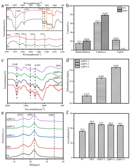 Chemical components and crystal structure of all specimens for (a) the FTIR spectra of PV during delignification, (b) the change of chemical components of PV after delignification, (c) the FTIR spectra of DPV after acetylation treatment, (d) the substitution degrees of acetyl groups for ADPVs, (e) the XRD curves of ADPVs, and (f) the degree of crystallinity for all specimens.