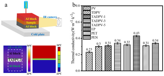 Superior thermal insulation is a key characteristic for transparent conductive substrates; here, the thermal conductivity of all specimens was investigated with a laser-infrared camera thermal-conductivity system. The steady-state temperature distribution was recorded using a FLIR Merlin MID Infrared (IR) camera. The temperature differences (ΔT) between the top and bottom surfaces of the TADPVs and the bulky epoxy resin were recorded [34], respectively, as shown in Figure 7a. Clearly, the thermal conductivities of all TADPVs had a small enhancement compared to TDPV, in which TADPV-3 demonstrated the highest thermal conductivity of 0.34 Wm−1 K−1, while the thermal conductivity of TDPV was only 0.30 Wm−1 K−1. This is mainly attributed to the increase of the infiltrated epoxy resin in TADPVs. The bulky epoxy resin possessed a higher thermal conductivity of 0.43, obtained from our testing results, which were higher than those of the fast-growing poplar [35], whose value was about 0.23 Wm−1 K−1. Accordingly, the TADPVs exhibited increased thermal conductivities. In spite of this, the thermal conductivity of the TADPV-3 was close to those of PET and PEN [36], whose thermal conductivities were 0.31 Wm−1 K−1 and 0.34 Wm−1 K−1, respectively, as displayed in Figure 7b. These results indicated that the TADPV-3 could be used as a candidate for he flexible transparent substrate of electron devices due to its excellent thermal insulation.