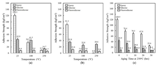 Comparison of adhesion strength of epoxy, silicone, and fluorosilicone resins: (a) Adhesion strength measured at 23 °C, 180 °C, 250 °C; (b) Adhesion strength measured at 23 °C, 180 °C, 250 °C after aging at 85 °C/85% RH for 168 h; (c) Adhesion strength as a function of aging time at 250 °C.