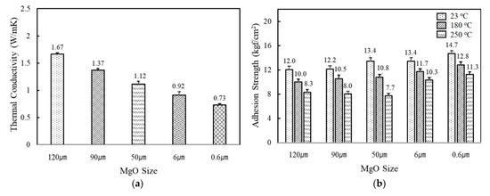 Figure 2a shows the variation of thermal conductivity of fluorosilicone adhesives containing MgO and BN of different sizes and shapes. The filler concentration was kept at 60 vol%. When MgO were incorporated, higher thermal conductivity was obtained using larger fillers. The thermal conductivity value of adhesives filled with 120 μm MgO was more than two times higher than 0.6 μm MgO, i.e., 1.67 W/mK for 120 μm and 0.73 W/mK for 0.6 μm. Small fillers have a large interfacial contact area with the resins and thus more phonon scattering occurs. In addition, spherical MgOs have favorable filler packing for facile heat dissipation through the composites. As adhesives in electronic circuits not only provide heat dissipation but also mechanical support, adhesion strength is another critical parameter. As shown in Figure 2b, the use of smaller fillers was favorable in order to obtain high adhesion strength. The adhesives filled with 0.6 μm MgO had an adhesion strength value of 14.7 kgf/cm2 at 23 °C, while the adhesives with 120 μm MgO had a strength value of 12.0 kgf/cm2. The adhesion strength gradually decreased as the test temperature increased. For example, an adhesion strength of 0.6μm MgO-filled adhesives was reduced from 14.7 kgf/cm2 to 12.8 kgf/cm2 at 180 °C and 11.3 kgf/cm2 at 250 °C, respectively. The reduced adhesion strength may be attributable to the difference in thermal expansion between adhesives and Cu substrates.