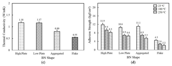 The thermal conductivity and adhesion strength of fluorosilicone adhesives filled with MgOs and BNs: (a) thermal conductivity of MgO-filled fluorosilicone; (b) adhesion strength of MgO-filled fluorosilicone measured at 23 °C, 180 °C, and 250 °C; (c) thermal conductivity of BN-filled fluorosilicone; (d) adhesion strength of BN-filled fluorosilicone measured at 23 °C, 180 °C, and 250 °C. The filler concentration was kept at 60 vol%.