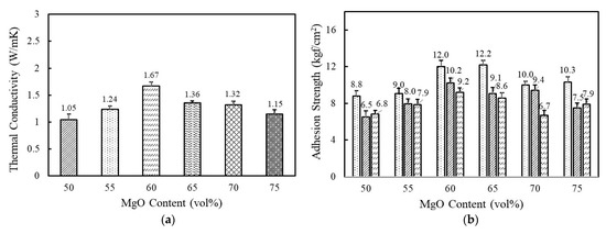 The thermal conductivity and adhesion strength of fluorosilicone adhesives as a function of MgO content: (a) thermal conductivity of fluorosilicone adhesives; (b) adhesion strength of fluorosilicone adhesives measured at 23 °C, 180 °C, and 250 °C.