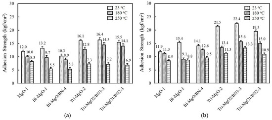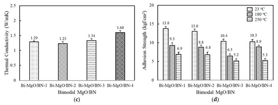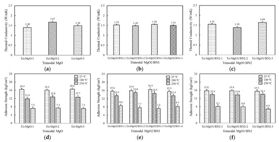 The adhesion strength of trimodal adhesives is illustrated in Figure 5d–f. Although the adhesives were composed of various combinations of MgOs and BNs, the adhesion strength at 23 °C was quite similar, near 16 kgf/cm2. Compared to unimodal and bimodal adhesives, a higher strength value was obtained because the third filler may enlarge the interaction area per unit gram. The adhesion strength at 180 °C fell in the range of 12.7~15.0 kgf/cm2 depending on composition, which was comparable to those of unimodal and bimodal adhesives at 23 °C. At 250 °C, the strength value was maintained above 7.0 kgf/cm2, except for Tri-MgO1/BN2-3.
