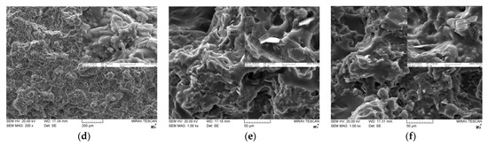 Figure 6 shows the cross-sectional SEM images of various bimodal and trimodal adhesives. The adhesives filled with various MgOs, i.e., Figure 6a,b,d, exhibited only a thick layer of fluorosilicone resin on the fracture surface, which in turn interrupted the identification of the majority MgO components. It is inferred that the trimethoxy silane moiety presented on the surface of spherical MgO may offer the proper compatibility and good level of dispersion within fluorosilicone resins. When BNs were added, fillers with various shapes such as plate and agglomerates could be clearly discerned in bimodal and trimodal adhesives, as illustrated in Figure 6c,e,f. The shape is more apparent at the enlarged scale. Although the surface of BNs was not chemically modified, the agglomerates of fillers were not observed over the entire area. Therefore, mechanical mixing using a three-roll mill was effective for the uniform dispersion of micro-sized MgOs and BNs.