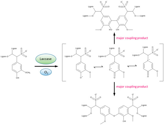 Laccase-mediated radical network expansion of lignosulfonates affording the two principal 5-5′ and 5-O-4′ coupling products.