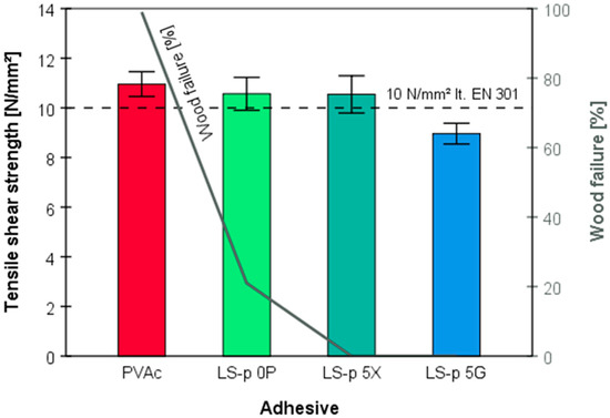 The extent of wood failure tested for glued assemblies is a quality criterion for the adhesive used. It represents a value which assesses whether the glueline or the adjacent wooden parts fail first while applying increasing tensile shear force. Respective tests revealed that samples bonded with commercial PVAc (D3) showed almost 100% wood failure, while all enzymatically polymerized LS-p formulations (average viscosity 500 mPas) reached a significantly lower percentage of wood failure, if at all. Even though the tensile shear strength of LS-p and LS-5X were very similar and all above the EN 301 minimum limit (cf. Figure 5), only a low extent of wood failure (20%, n = 15) was observed for the plasticizer-free formulation.
