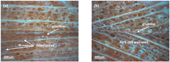 Reflected-light microscopic images of the wood samples glued with PVAc (a), and with LS-p without plasticizer (b). Notice the thicker glueline in (a), while (b) has a thin glueline, with lignosulfonates seemingly impregnating adjacent lumen and cell wall areas (“dark cell wall area”).