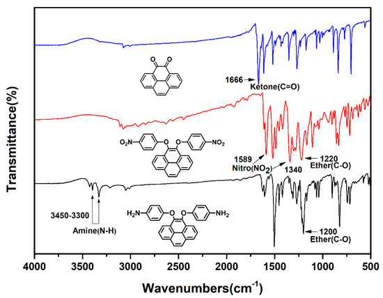 Due to high tendency oxidation from 4,5-dihydroxypyrene to pyrene-4,5-dione in atmosphere, dinitro compound (2) was synthesized by a one-pot direct reduction of a carbonyl group of pyrene-4,5-dione with sodium dithionite to be converted to a diol intermediate and then this was followed by the diarylation of 4,5-dihydroxypyrene with 4-fluoronitrobenzene in the presence of sodium hydroxide as the base and tetra-n-butylammonium bromide salt as the phase transfer catalyst [46]. The final target diamine monomer 4,5-bis(4-aminophenoxy)pyrene (3) was prepared by a hydrazine Pd/C-catalyzed reduction of 4,5-bis(4-nitrophenoxy)pyrene (2) in a high yield. The structures of pyrene-4,5-dione (1), the dinitro intermediate (2) and the target diamine monomer (3) were confirmed with IR, NMR and single crystal X-ray diffraction analysis. The FT-IR spectra of compounds 1 to 3 can be seen in Figure 1. Pyrene-4,5-dione (1) shows the characteristic absorption at 1666 cm−1 (ketone C = O stretch). After the reduction of the carbonyl group of (1) and then the following diarylation to form a bis(nitrophenoxy)pyrene unit, the ketone characteristic band disappeared and the nitro groups show the pair characteristic absorption bands at 1340 and 1589 cm−1 (-NO2 symmetric and asymmetric stretching), and a strong aryl ether band located at 1220 cm−1 (C-O stretching). After reduction to diamine 3, the nitro group absorptions were eliminated, and the primary amino unit showed the typical absorption pair located at 3450–3300 cm−1 as a result of N-H stretching.
