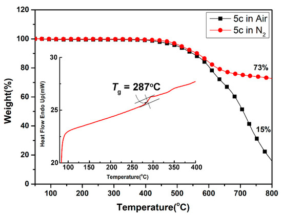 For universal applications of these polymers in optoelectronics, the thermal stability and phase transition temperatures of polyamides were recorded using thermogravimetric analysis (TGA) and differential scanning calorimetry (DSC), and all the thermal behavior data of the polymers are summarized in Table 2. A representative set of TGA and DSC curves of polyamide 5c are presented in Figure 5. Except for the semi-aromatic polyamide 5a with aliphatic cyclohexane moiety, all the polymers possess excellent thermal stability and did not show significant weight loss up to temperatures of approximately 450 °C in both a nitrogen and air atmosphere. The decomposition temperatures (Td) at a 10% weight-loss of the aromatic polyamides (5b to 5e) in nitrogen and air were recorded in the ranges of 544–562 °C and 519–549 °C, respectively. Except for aliphatic-aromatic polyamide 5a, the amount of carbonized residue (char yield) of the other polyamides was more than 69% and as high as 74% at 800 °C in nitrogen. The high char yields of these fully aromatic polyamides can be ascribed to their high rigid aromatic composition. Due to the incorporation of thermally stable and the highly aromatic content of pyrene unit, all the polymers exhibited higher Td values compared to their corresponding 5′ series analogue derived from 2,3-bis(4-aminophenoxy)naphthalene [49]. These thermal stable polyamides also have high glass-transition temperatures (Tg) with a range from 276 to 310 °C. As expected, the lowest Tg of polymer 5a can be illustrated in terms of the bendable polycyclohexane segments in its backbone. As compared to the naphthalene-based 5′ series analogs, the present polyamides 5 series demonstrates a remarkably increased Tg owing to the presence of rigid pyrene segments. Notably, among the substituent effects of these polyamides, it was found that the factors of the increased Tg values were dependent on the rigidity of the diacid counterpart structures. Thus, the thermal analysis reports above disclosed that these polyamides, especially the aromatic ones, exhibited excellent thermal stability, which, in turn, is beneficial to increase the manufacturing process in as optoelectronic device application and improve the morphological stability to both the spin-coated and slot-die coated film.