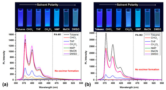 PL spectra of the dilute solution of model compound (a) M1 and (b) M2 (ca. 10 μM) in solvents of various polarity. Photographs were taken under illumination of a 365-nanometer UV light.