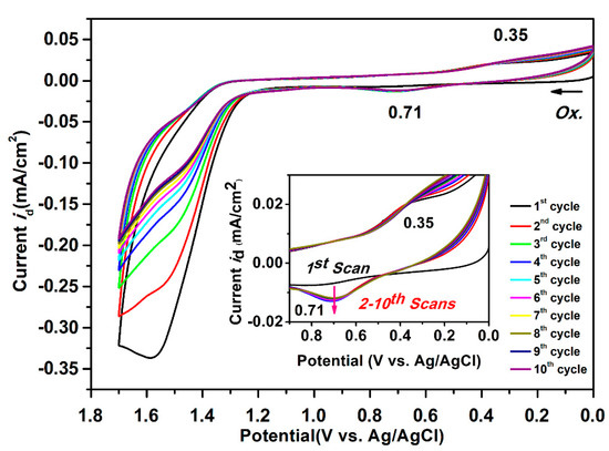 Based on the oxidation and reduction onset potential of CV, the electrochemically bandgaps (EgCV) for polyamides 5a–5e were determined in the range from 2.56 to 2.97 eV. The optical bandgaps (Egopt) calculated from the absorption edge (λonset) of the polymer films were recorded in the range from 3.35 to 3.40 eV. Compared to EgCV and Egopt, the bandgaps calculated from CV measurements were much lower than those obtained from the absorption spectra at about 0.33 to 0.74 eV. The highest occupied molecular orbital (HOMO) levels for the polyamides 5a–5e were calculated and found to be between −5.56 and −5.61 eV and the values for the lowest unoccupied molecular orbital (LUMO) levels between −2.64 and −3.02 eV by using the oxidation and reduction onset potential. When the calculations were based on the E1/2 values, the HOMO and LUMO energy levels were estimated in the range of −5.53 to −5.59 eV and −2.37 to −2.89 eV, respectively. The CV curves of model compounds of M1 and M2 were similar as the polyamides, as shown in Figure S14, but the model compound M1 did not find any anodic peak upon the oxidation process. These CV curves of the polyamides 5a–5e with continuous ten cycles of a scan rate of 50 mV/s were similar to the model compound M2 as shown in Figure 10. As shown in the first CV scan, the dioxypyrene unit underwent oxidation at about 1.3 V, followed by fully oxidation peak at 1.6 V. In the second scan, a new oxidation peak appeared at around 0.71 V and intensified the same peaks after ten cycles, which indicated the occurrence of the coupling reactions between two pyrene cation radicals forming the dimer-like bispyrene moiety in the 1- or 8-position of the electroactive site of the pyrene unit, as shown in Scheme 5 of the proposed structures of the electro-generated dimers.