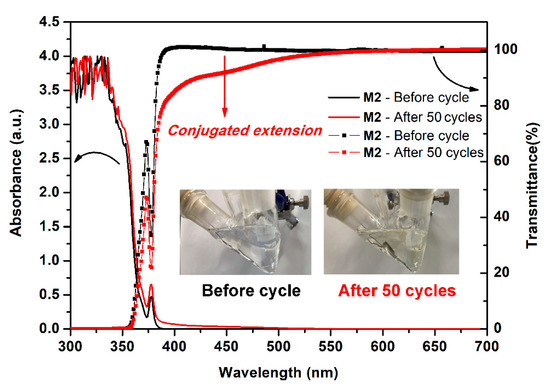 Absorption, transmittance spectra and inset images of the 500 μM model compound M2 in 0.1 M Bu4NClO4/CH2Cl2 before and after continuous 50 cycles of CV test at a scan rate of 50 mV/s.