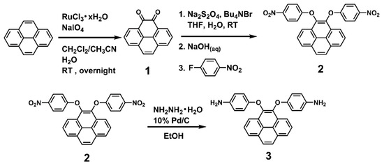 The dietherpyrene-based diamine 3 was successfully synthesized by the synthetic route outlined in Scheme 1. Pyrene-4,5-dione (1) was prepared by using a modified procedure from the selective K-region oxidation of pyrene that presented the stoichiometric quantities of ruthenium tetraoxide (RuO4) from the RuCl3/NaIO4 catalytic system in previous studies [43,44,45]. The postulated oxidation mechanism pathways from starting pyrene to pyrene-4,5-dione intermediates are shown in Scheme 2.