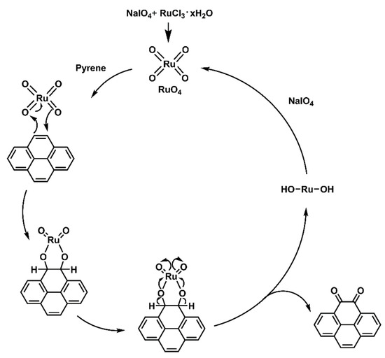 The postulated oxidation mechanism pathways of pyrene using RuCl3/NaIO4 catalytic system.