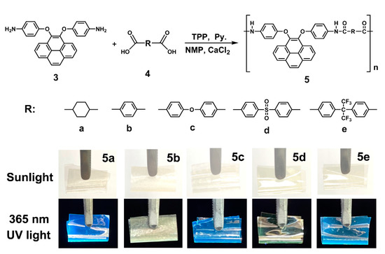 Synthesis of dietherpyrene-based polyamides and their foldable films before and after irradiated by laboratory UV lamp at wavelength of 365 nm.