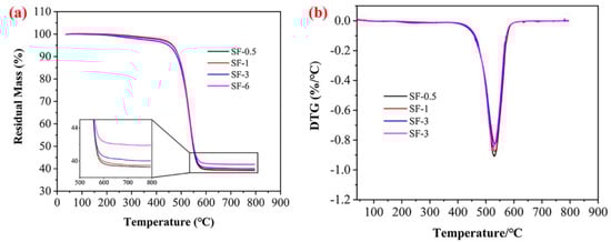 TGA (a) and DTG (b) patterns of composites under a nitrogen atmosphere.