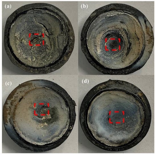 Macroscopic appearance of ablated composites: (a) SF-0.5; (b) SF-1; (c) SF-3; (d) SF-6. Red dotted box areas were used to identify crystal phases.