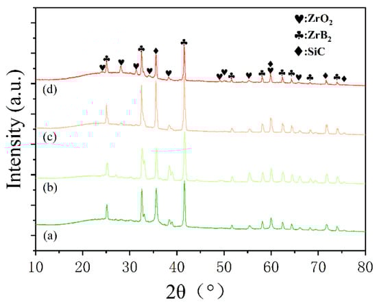 The red, dotted box areas in Figure 5 of the ablated composites were peeled and identified by XRD as shown in Figure 6. There were three distinct XRD peaks at approximately 35.9°, 60.5°, and 71.9° that matched to (111), (220), and (311), indicating the presence of SiC [32]. In addition, SiC may be produced by the reduction reaction of C and SiO2 at high temperature. Moreover, the characteristic peaks of SiO2 (PDF 65-0466) did not appear due to the melting point of SiO2 (1723 °C) being much lower than the temperature of the oxyacetylene flame (3000 °C), and the molten SiO2 could be easily blown away by high-speed heat flux because of its low viscosity. Furthermore, the weak characteristic peaks of ZrO2 (PDF 37-1484) formed by the oxidation of ZrB2 were observed only in SF-3 and SF-6 [33]. Compared to SiO2, the melting point of ZrO2 (up to 2700 °C) was close to the temperature of the oxyacetylene flame. Although most of the ZrO2 was carried away by the high-speed heat flux to provide heat dissipation, and the successive skeleton formed by longer CFs (more than 3 mm) played a fixed role, allowing the ZrO2 to stay on the ablated surface for a long time, allowing for observation.