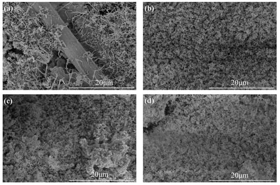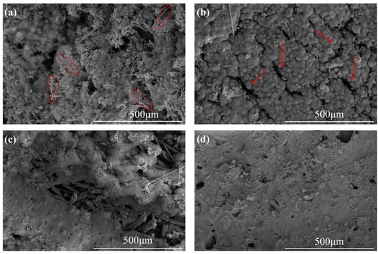 Many studies attribute the diversity of the ablation properties of composites to the different structures of the formed ceramic layers during ablation tests, such as the integrity and denseness as well as strength of the ceramic layer [10,15,16]. The macroscopic appearance of the ablated surface is shown in Figure 5, and different shapes of pits were observed on the sample after ablation. In addition, the ceramic layer of SF-0.5 showed obvious cracks, indicating weak strength and poor interaction between the ceramic layer and virgin materials, and increasing the length of CFs improved the compactness and integrity of the ceramic layer (Figure 5c,d). Moreover, the surfaces of all ablated composites were covered with an off-white material, probably a mixture of silica and zirconium dioxide (an oxidation product of zirconium boride).