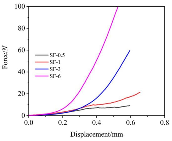 The excellent compression resistance of the ceramic layer makes an outstanding contribution to the resistance of particle or heat flow erosion. The ceramic layer was peeled off, and the compression test results are illustrated in Figure 9. It can be easily seen that fiber length had a significant effect on the compressive properties: increasing the length promoted compressive resistance. It is noteworthy that unsmooth displacement–force curves for SF-0.5 and SF-1 were observed, while the curves for SF-3 and SF-6 were not only smooth but also had much better compression resistance than SF-0.5 and SF-1, which corresponded to the results of Rl and Rm.