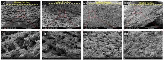 The cross-sectional structure of the ceramic layer of the ablation was characterized by SEM to analyze the ablation mechanism in detail, and the results are shown in Figure 10. For SF-0.5, numerous holes inside the ceramic layer were observed, and many CFs were exposed (Figure 10a,e), which is consistent with the ablated surface. Moreover, the integrity and strength of the ceramic layer were poor due to the insufficient reinforcing effect of CFs with short length on the ceramic layer (Figure 7a and Figure 9). Therefore, it can be inferred that the main reason for the poor ablation performance of SF-0.5 was the weak interfacial interactions and that the local skeleton was unable to transfer the forces generated by ablation to the whole ceramic layer, thus causing the ceramic layer to break down (as shown in Figure 11a). For SF-1, the ablation holes inside the ceramic layer were reduced, and the integrity of the ceramic layer was better (Figure 10b,f). Because the fibers were long enough, they could take advantage of their length to concatenate and consolidate the ceramic fillers to form a relatively complete ceramic layer. Thus, the residue and the molten fillers could survive on the ablated surface of the ceramic layer for a longer time rather than be entirely blown away, showing favorable resistance to oxidizing gas and high-speed heat flux. With further growth of the CFs length, the inside of the ceramic layer tends to be extremely dense, and the consolidation of CFs are better reflected (Figure 10c,d). Under the action of the successive skeleton formed by long CFs, the ablation resistance of silicone rubber-based composites is primarily determined by the ceramic layer on the ablated surface to endure oxidizing gas and high-speed heat flux (shown in Figure 11b). Here, the increase in length of CFs from 3 to 6 mm with a slight improvement in Rl and Rm has been adequately explained.