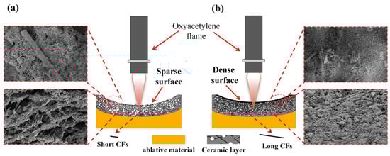 Ablation mechanism of CF-filled silicone rubber-based ablative composites: (a) short carbon fibers, (b) long carbon fibers.