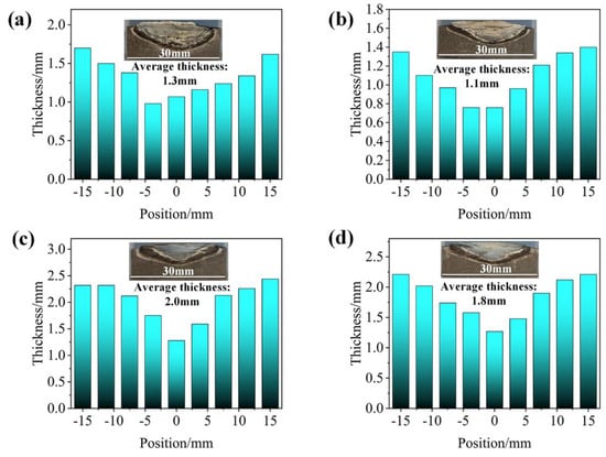 Thickness distribution of the ceramic layer: (a) SF-0.5; (b) SF-1; (c) SF-3; (d) SF-6.