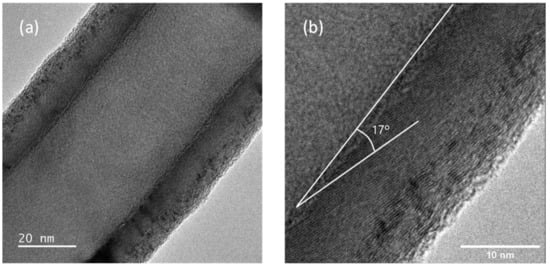 Representative TEM images of the used CNFs are shown in Figure 1. The diameter of 25 CNFs was measured and an average diameter of around 110 nm was obtained. This diameter is comparable to the values measured by Tessonnier et al. for the same type of CNFs []. The CNFs show a two-layer structure surrounding the hollow tubular core, where the inner layers present parallel nanosheets with respect to the hollow core. In particular, the inner layers of Figure 1b were composed of 29 nanosheets with individual thicknesses of about 0.32 nm and angles of around 17° with respect to the main axis of the CNF. Similar nanosheets are also present in the outer layers, though they are not as ordered as in the case of the internal layers. In total, 19 outer graphene sheets with dimensions between 0.32 and 0.35 nm are observed in Figure 1b. As a conclusion, Figure 1a,b showed two types of morphologies enclosing the hollow tubular core. Moreover, the inner layers seem to be better graphitized than the outer ones.