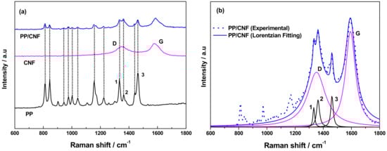 Figure 3 shows the Raman spectra obtained from PP, as-received CNF powder and the PP/CNF composite in the range between 600 and 1800 cm−1. Polypropylene shows rich Raman spectra with modes in the range 800–1500 cm−1 [] assigned to CHn stretching vibrations []. On the other hand, the as-received CNFs present the two bands expected in carbon nanostructures. One band is found at 1352 cm−1, known as the disordered-induced D band [], observable when defects are present in the carbon aromatic structure, and the G-band is found at 1580 cm−1, characteristic of the ideal graphitic lattice vibration []. As expected, the PP/CNF composite presents the signatures of the two base materials. In particular, the most intense modes of PP (dotted lines in Figure 3a) are clearly observable in PP/CNF composites. Interestingly, a relative intensity change is observed between the two PP peaks located at the vicinity of 800 cm−1, which can be related to the presence of the CNFs in the PP/CNF composite. Moreover, the peak at 1460 cm−1, corresponding to the PP (numbered as 3 in Figure 3a) also shows the same intensity as the G and D bands in the PP/CNF composite, whereas peaks 1 and 2 of the PP hide the D-band of the CNFs in the PP/CNF composite (Figure 3b). These results suggest a strong presence of PP in the analysed area. It is also of note that the G peak for the PP/CNF composite shows an apparent shoulder peak at ~1600 cm−1, which can be associated to the existence of a D’ mode caused by defects in the CNFs []. The peak position and the full width half maximum (FWHM) of the modes for CNFs and the PP/CNF composite were determined by fitting the Raman spectra with Lorentzian functions, and the obtained parameters are listed in Table 1 together with the in-plane graphitic domain size (La) calculated according to La (nm) = 4.4/(ID/IG) []. Interestingly, the FWHMG (90) and FWHMD (115) of the CNF powder are higher than previous values reported for the same type of CNFs []. Typically, a decrease in the width of the D and G bands has been associated with an enhancement of the degree of graphitization in CNFs []. Notably, the values of FWHMG and FWHMD decrease clearly in the PP/CNF composites, an observation that has been attributed earlier to the increasing size of remaining agglomerates when enhancing the concentration of CNFs []. However, such effect was not observed based on the SEM images shown in Figure 2. Table 1 shows that the G and D peak positions were practically the same and with slightly higher wavenumbers than the CNF powder in the PP/CNF composite. This indicates that the processing did not affect seriously the structure of the as-received CNFs. The intensity ratios between the D and G bands (ID/IG) were calculated and presented also in Table 1 since they are an important parameter for quantifying the number of disordered (D) and ordered (G) carbon atoms []. Notably, the ID/IG of 0.76 for the CNF powder results lower than the value of 1 reported for the same type of CNFs []. Moreover, the ID/IG remains practically the same for the CNF powders and the PP/CNF composites, and, therefore, the production of the PP/CNF composites by melt-mixing did not have a strong effect on this parameter. However, the calculated in-plane graphitic domain size La was slightly higher for the PP/CNF composite. This result agrees with a previous work on melt-mixed PP/CNF composites made with another grade of Pyrograf®-III CNFs (PR 24 LHT XT), and it can be explained by the increase of the PP crystallite size caused by the introduction of CNFs [].