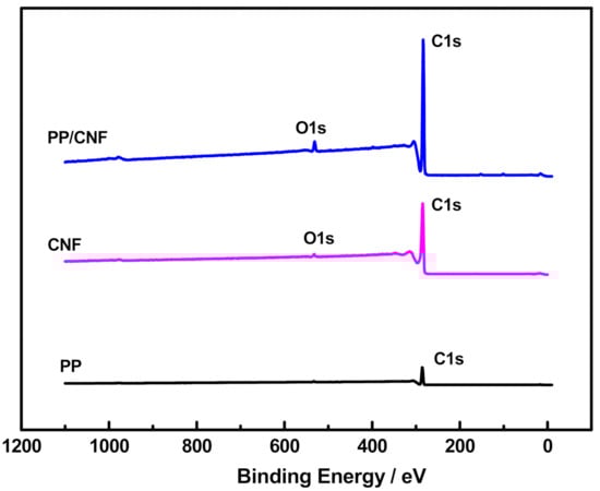 XPS survey spectra of PP, CNF powder, and PP/5 wt.% CNF composite.