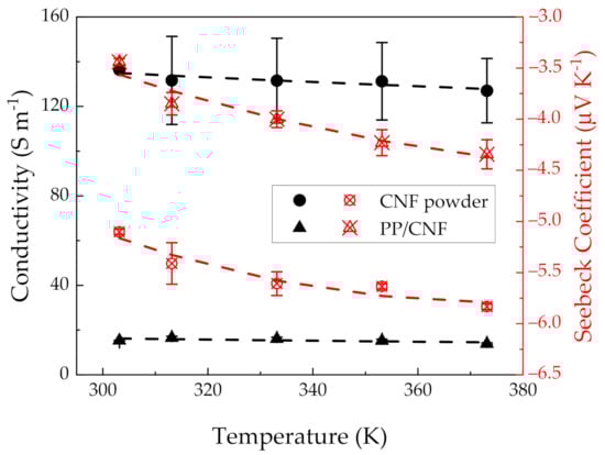 The power factor PF as function of temperature of the PP/CNF composite and CNF powder were calculated, and the results are shown in Table 3. At 303.15 K, the CNF powder shows a PF of 3.5 × 10−3 μW·m−1·K−2, whereas the PP/CNF composite achieves a PF of 1.8 × 10−4 μW·m−1·K−2 (lower than the PF of 7.0 × 10−4 obtained in PP/CNF composite with 5 wt.% of PR 24 LHT XT CNFs []). The PF increases in both materials at 373.15 K as a consequence of its proportionality to S2. The CNF powder achieves a value of 4.3 × 10−3 μW·m−1·K−2, whereas the PP/CNF composites achieves a PF of 2.6 × 10−4 μW·m−1·K−2. For comparison, PF values of ~10−1 μW·m−1·K−2 have been recently reported in a melt-mixed PP composite with 2 wt.% of p-type boron-doped SWCNTs [].