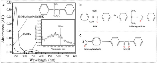 (a) Absorption spectra of PMMA and BDK-doped PMMA, the inset shows the zoomed-in absorption spectrum from 302 to 395 nm. Reprinted with permission from [19]. (b) Structure change of BDK under UV irradiation [20,21]; (c) Formation of benzil molecules from benzoyl radicals generated under UV irradiation on BDK [20,21].