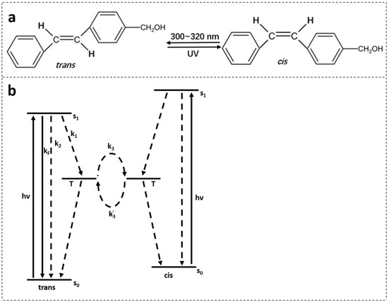 (a) 4-stilbenemethanol isomerization from trans to cis under UV irradiation [27,48]. (b) Energy level scheme involved in the photoisomerization process of the TS compound. Reprinted with permission from [29].