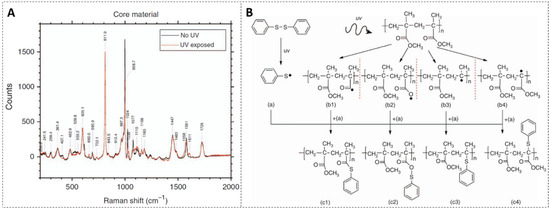 (A) Raman spectra before and after UV exposure on the DPDS-doped core material. Reprinted from [4]. (B) DPDS is split into two sulphenyl radicals upon UV exposure (a), four photodegradation reactions of the PMMA chain are considered, which are the removal of the: group (b1) and group (b2) from the side chain, complete side chain (b3) and group on the other side of the side chain (b4), followed by the attachment of the sulphenyl radical (c1–c4), respectively. Reprinted from [4].