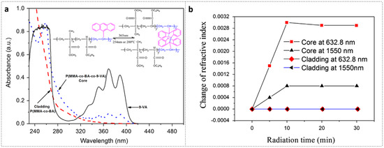 (a) Absorption spectra of cladding material [P(MMA-co-BA)] (dashed line), core material [P(MMA-co-BA-co-9-VA)] (dotted line) and pure 9-VA (solid line); The inset presents the reaction of photo-crosslinking and dissociation under 365 nm UV irradiation. Reprinted with permission from [30]. (b) The refractive index changes of core and cladding materials under 365 nm UV irradiation as a function of time. Reprinted with permission from [30].
