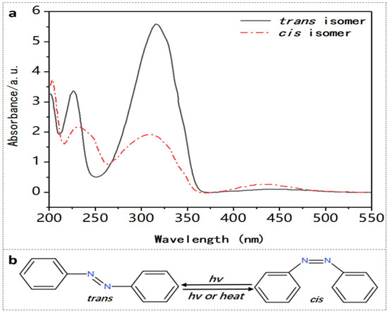 AZO has two different isomers, i.e., trans- and cis-AZO [57], which have different absorption spectra [58], as shown in Figure 7a. The absorption spectrum of AZO includes a strong and a weak absorption peak corresponding to the and electronic transition of the trans-isomer and the cis-isomer, respectively [59]. The trans-AZO presents a considerable absorption in the wavelength range of 320–380 nm owing to the trans-cis photoisomerization, while visible light irradiation in the range of 400–500 nm triggers the reverse cis-trans transition, accompanied by considerable heat generation [25,42,57]. The transformation process is depicted in Figure 7b. The absorption change on photoisomerization corresponds to the refractive index change, according to the Kramers–Kronig relationship [60].