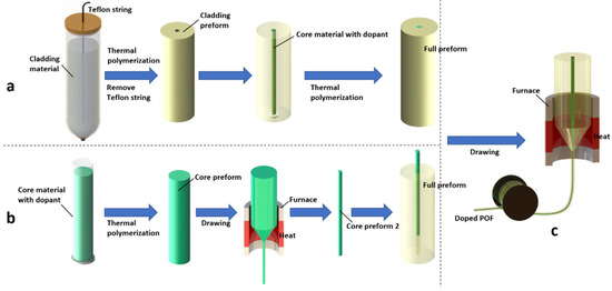 For the first time in 2018, Bonefacino et al. [4] produced a DPDS-doped PMMA POF (pure PMMA as cladding material and DPDS-doped PMMA as core material) using the pull-through technique. Before the polymerization of the cladding, a pre-polymerization process to prepare the solution took place in a sealed glove box to avoid the oxygen reaction with the heated solution, and this procedure allowed fabricating preforms with fewer dust particles and lower humidity [4]. Afterwards, the cladding preform was fully polymerized by heat treatment. Separately, the core mixture is poured into a smaller test tube. After curing in the oven, the core preform was drawn into a cane with smaller dimensions using a custom-made POF drawing tower. Then, the cane was tightly inserted into the cladding preform to get the full preform. The resultant preform was drawn into the fiber, as depicted in Figure 8c. In the work [20,35,65], their team again successfully fabricated the BDK-doped PMMA POF by using this technique. The cladding of the POF is made of pure PMMA, and the core material consists of BDK, BzMA, and PMMA.