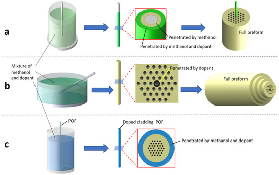 The fabrication process of doped mPOF by using diffusion doping technique: core preform diffusion (a), central hole diffusion (b), POF cladding diffusion (c) [33,34,42].