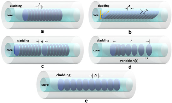 The structural diagrams of standard FBG (a), TFBG (b), PSFBG (c), CFBG (d) and LPFG (e).