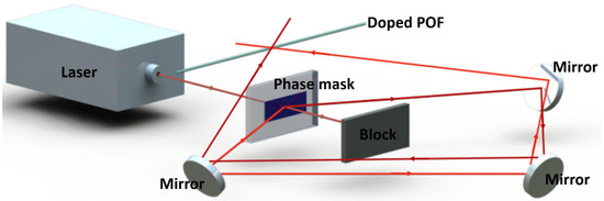 Normally, there are two systems for inscribing FBGs. The first inscription system is based on Signac optical ring interference [31,64,90], and only the two first-order beams diffracted by the phase mask are involved in the interference generation while blocking the zero-order diffraction beam [8], as shown in Figure 11. FBG inscriptions by the Signac optical ring interference system were reported by [19,31,32,64]. Luo et al., achieved the rapid fabrication of the FBG with a reflection peak up to 14.4 dB for only 4 min on a BDK-doped multimode (MM) PMMA POF using a 355 nm Nd:YAG pulse laser in 2012 [32].