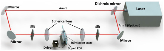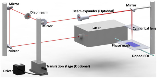 Additionally, researchers use the laser and phase mask technique to inscribe FBGs, which is more popular [23,38,43,71,89]. The set-up is illustrated in Figure 12. Here, the output laser beam is directed to the POF by four mirrors to maintain the output polarization state [89]. A diaphragm is used to shape the laser beam. An auto-driven translation stage is used to scan the laser beam along the fiber core for grating length improvement. A beam expander can also be used to increase the grating length. A cylindrical lens is hired to focus the laser beam to increase the power density on the fiber core. A phase mask optimized at laser emitting wavelength is positioned closely before the fiber to form interference light.