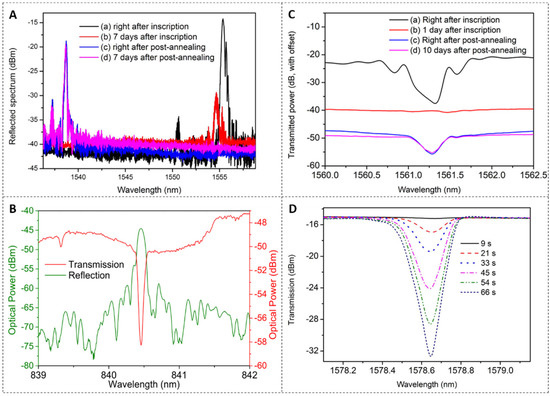 (A) Reflected amplitude spectra of FBGs [(a) just after inscription, (b) 7 days after inscription, (c) just after post-annealing, and (d) 7 days after post-annealing]. Reprinted with permission from [29]. (B) Reflection and transmitted amplitude spectra of the inscribed FBG. Reprinted from [43]. (C) Transmitted amplitude FBG spectra [(a) just after inscription, (b) 1 day after inscription, (c) just after post-annealing for 1 day, and (d) 10 days after post-annealing]. Reprinted with permission from [20]. (D) The evolution of transmitted amplitude spectra during the FBG inscription process. Reprinted with permission from [49].